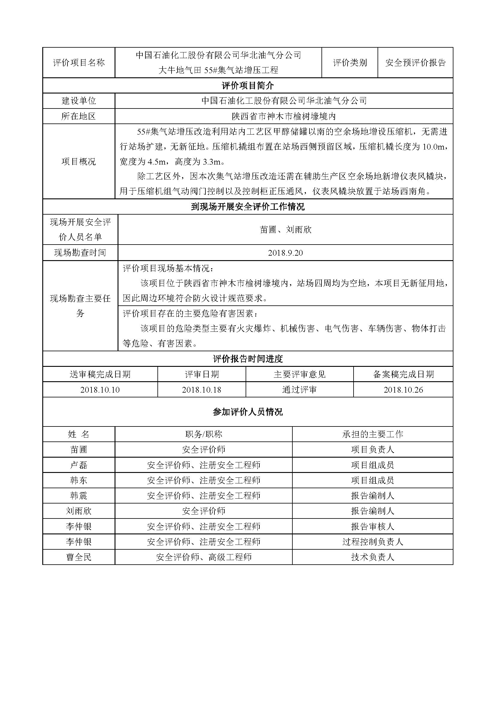 中國(guó)石油化工股份有限公司華北油氣分公司大牛地氣田55#集氣站增壓工程安全預(yù)評(píng)價(jià)
