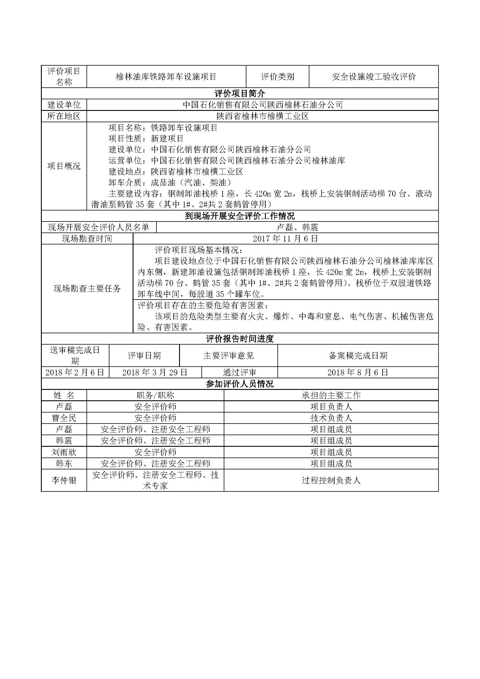 中國石化銷售有限公司陜西榆林石油分公司榆林油庫鐵路卸車設施項目安全設施竣工驗收評價