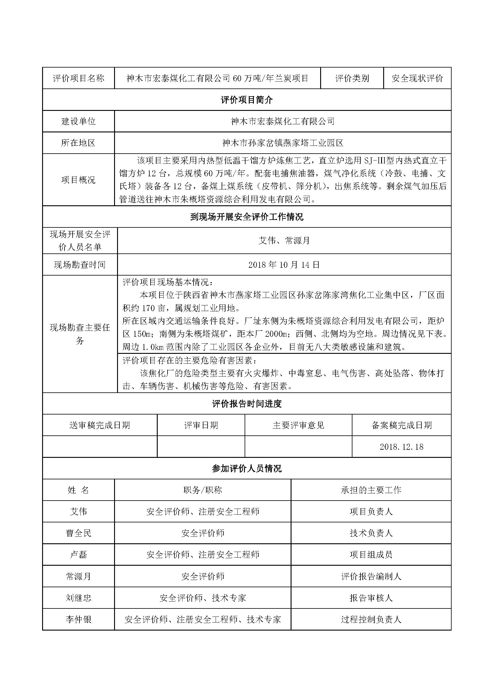 神木市宏泰煤化工有限公司60萬噸年蘭炭項(xiàng)目安全現(xiàn)狀評(píng)價(jià)