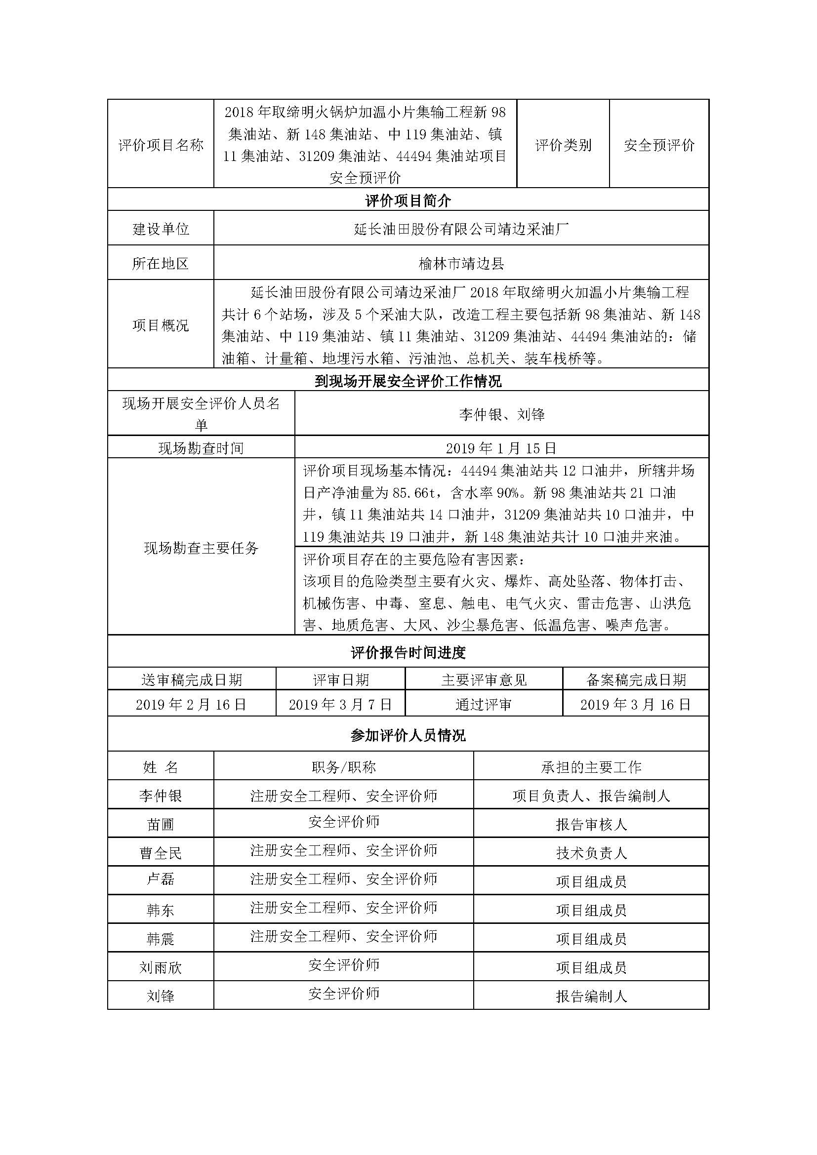 KLDAP[2019]-非煤-預-2 延長油田股份有限公司靖邊采油廠2018年取締明火加溫小片集輸工程新98集油站等6座站場安全預評價