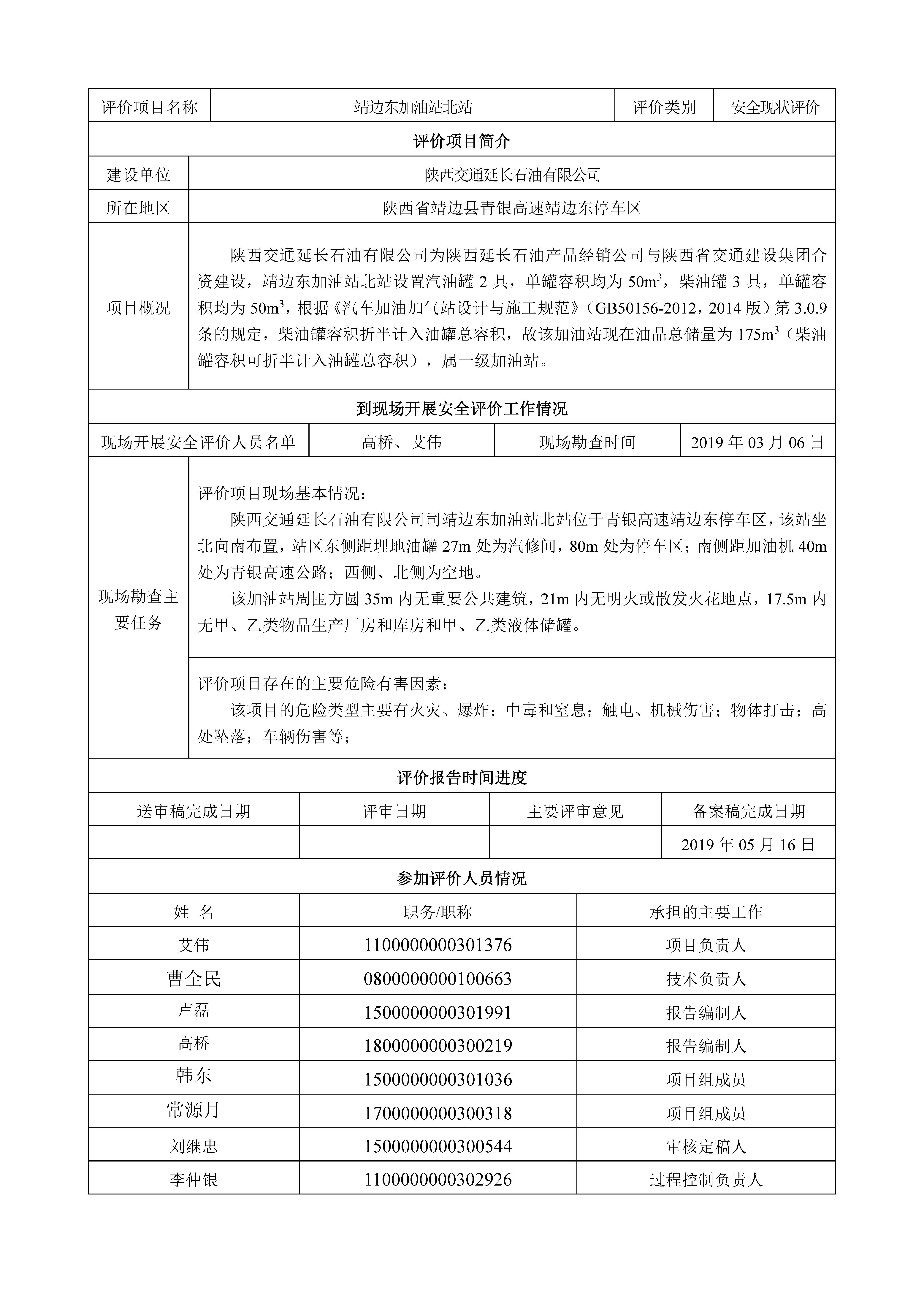 KLDAP[2019]-?;?現(xiàn)-3 陜西交通延長石油有限公司靖邊東加油站北站安全現(xiàn)狀評價