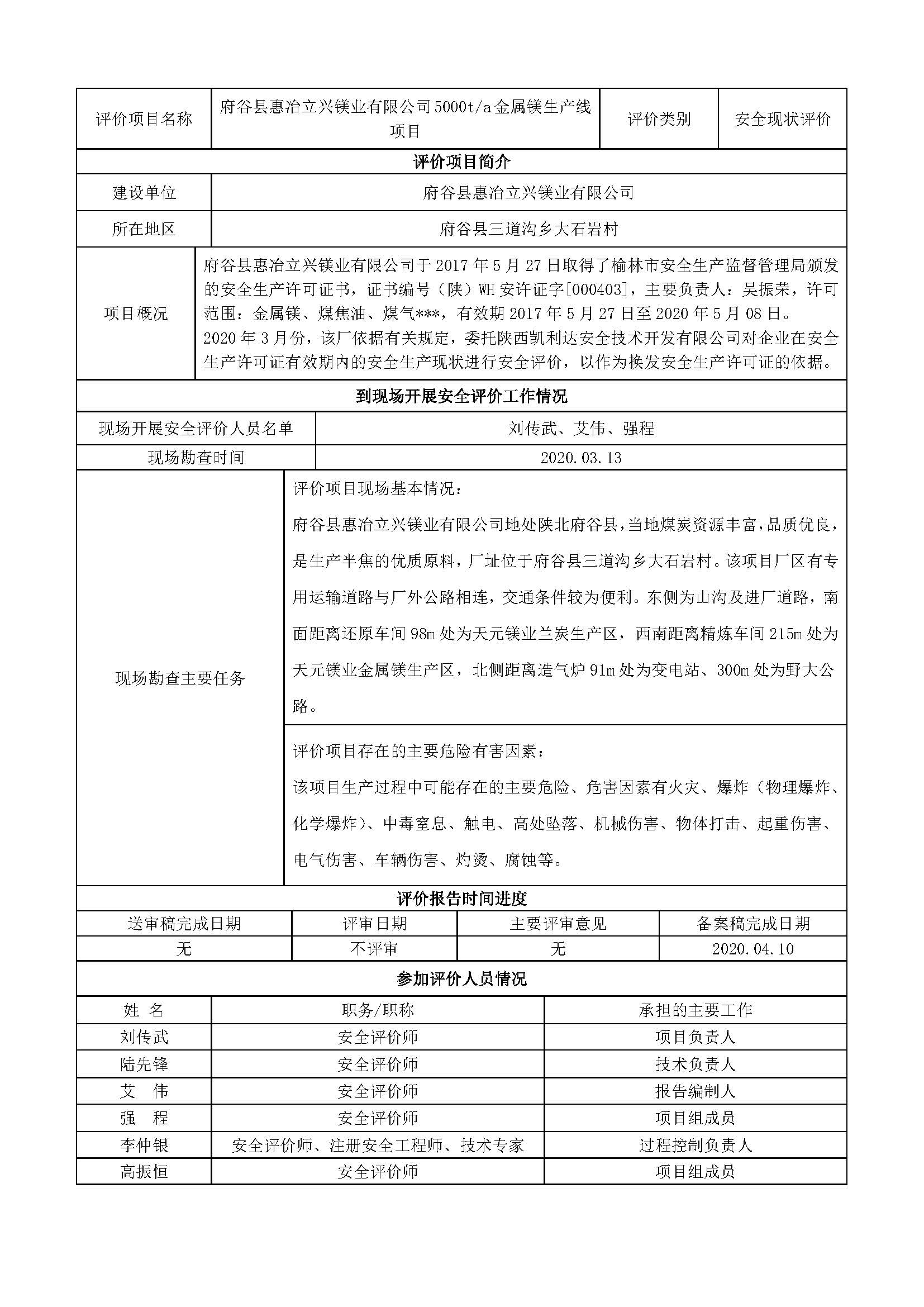 KLDAP[2020]-?;?現(xiàn)-1 府谷縣惠冶立興鎂業(yè)有限公司5000ta金屬鎂生產(chǎn)線項(xiàng)目安全現(xiàn)狀評(píng)價(jià)