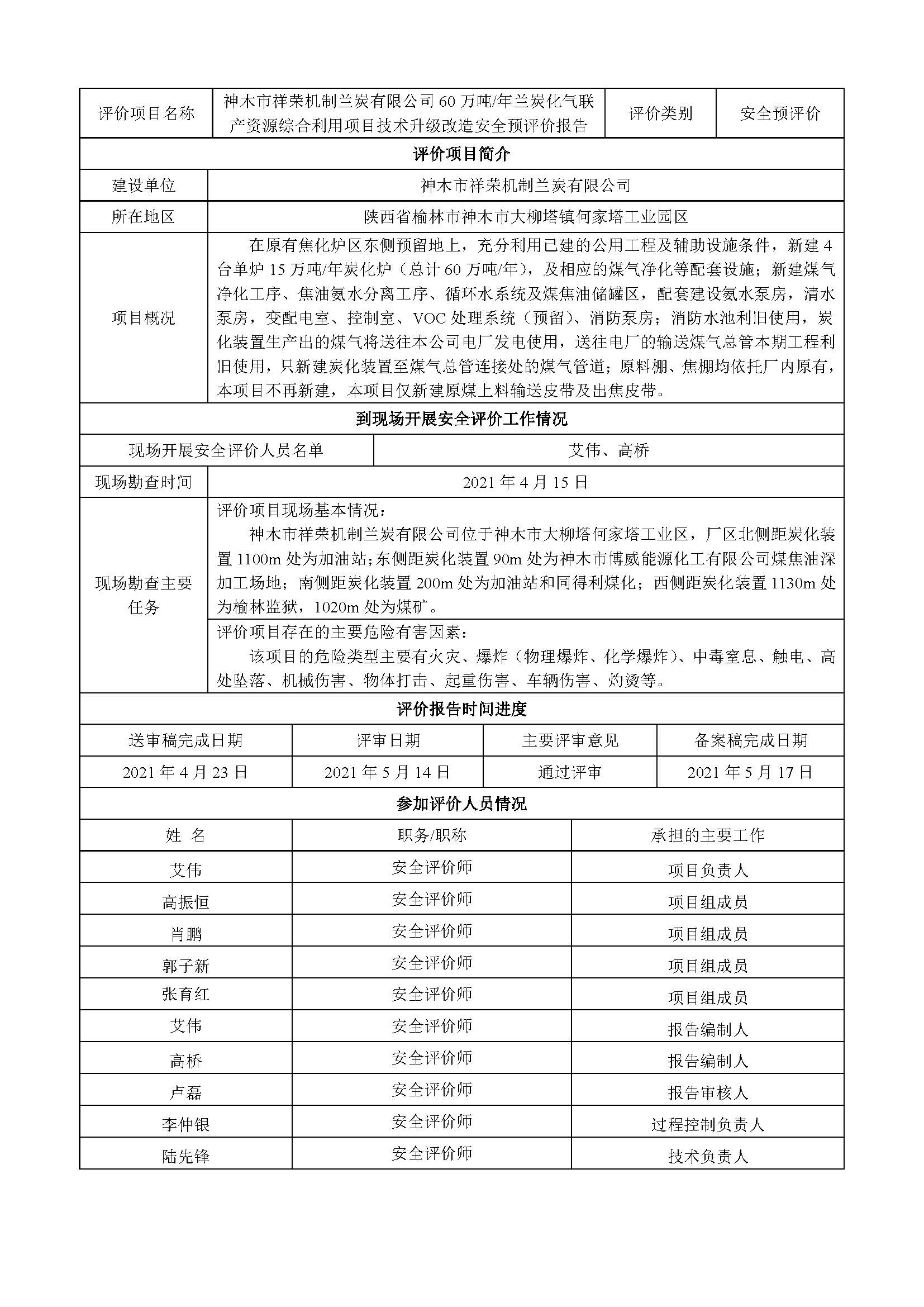 KLDAP[2021]-?;?預(yù)-4 神木市祥榮機(jī)制蘭炭有限公司60萬噸年蘭炭化氣聯(lián)產(chǎn)資源綜合利用項目技術(shù)升級改造安全預(yù)評價