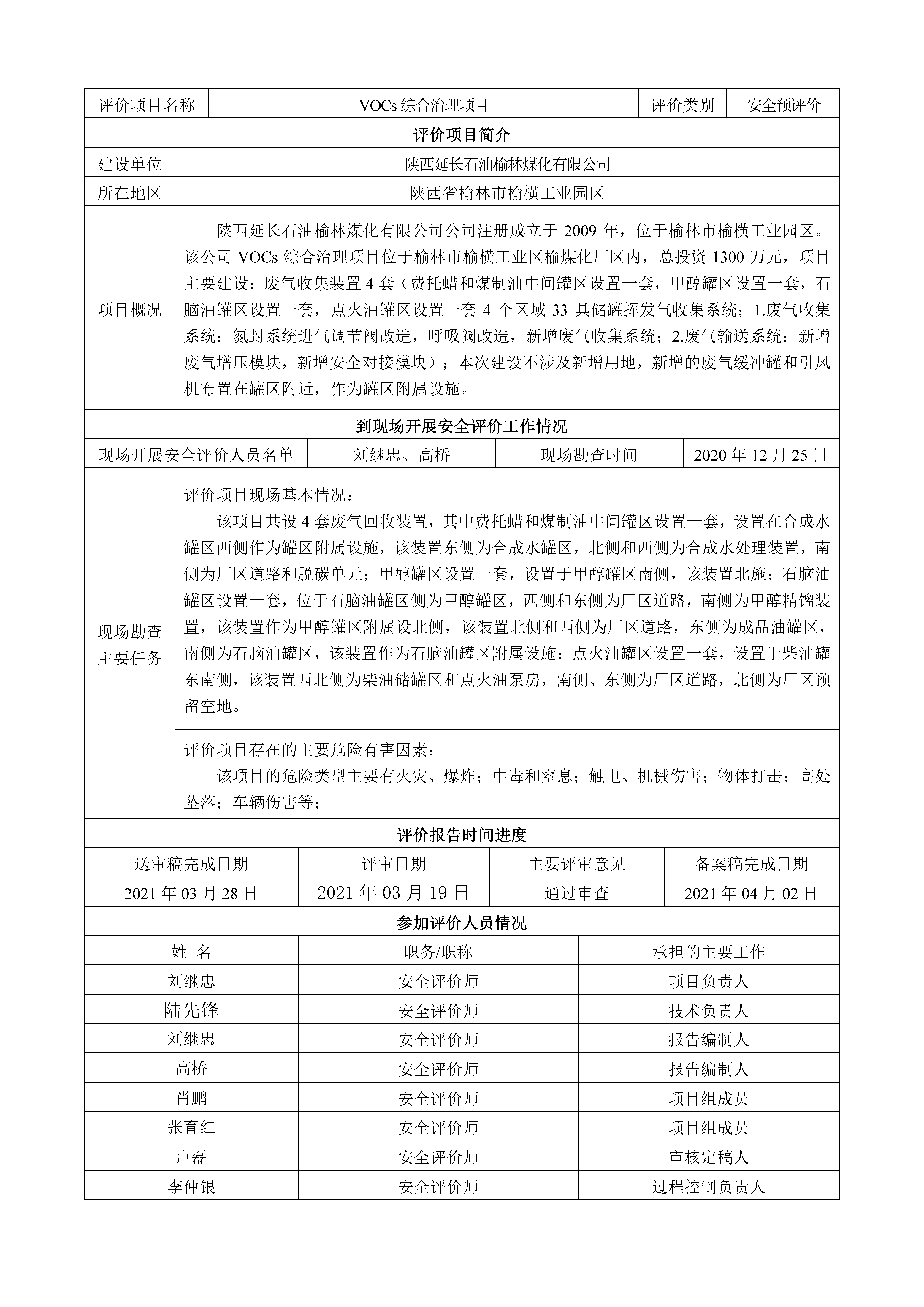 KLDAP[2021]-?;?預(yù)-1 陜西延長(zhǎng)石油榆林煤化有限公司VOCs綜合治理項(xiàng)目安全預(yù)評(píng)價(jià)