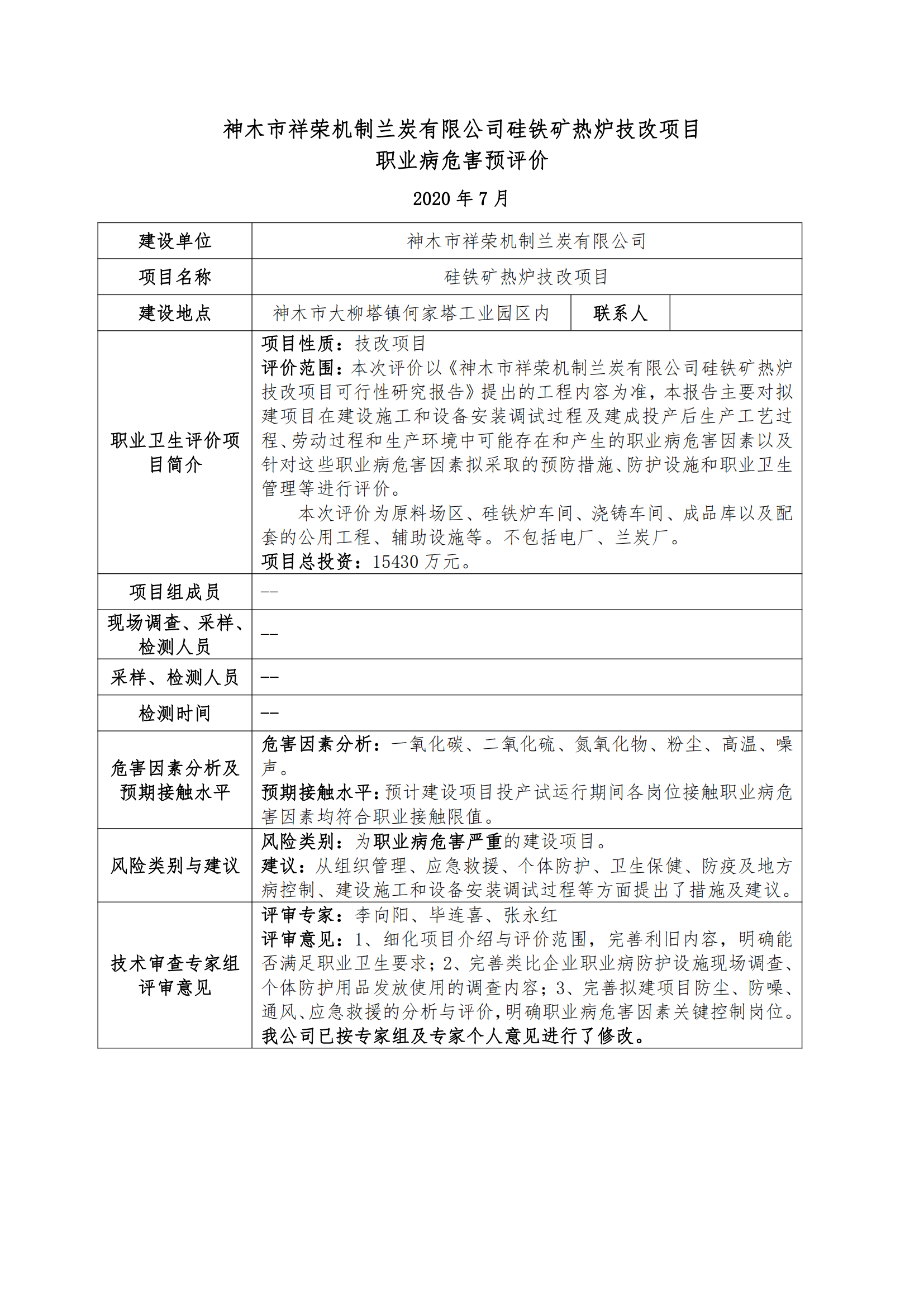 神木市祥榮機(jī)制蘭炭有限公司硅鐵礦熱爐技改項(xiàng)目職業(yè)病危害預(yù)評(píng)價(jià)