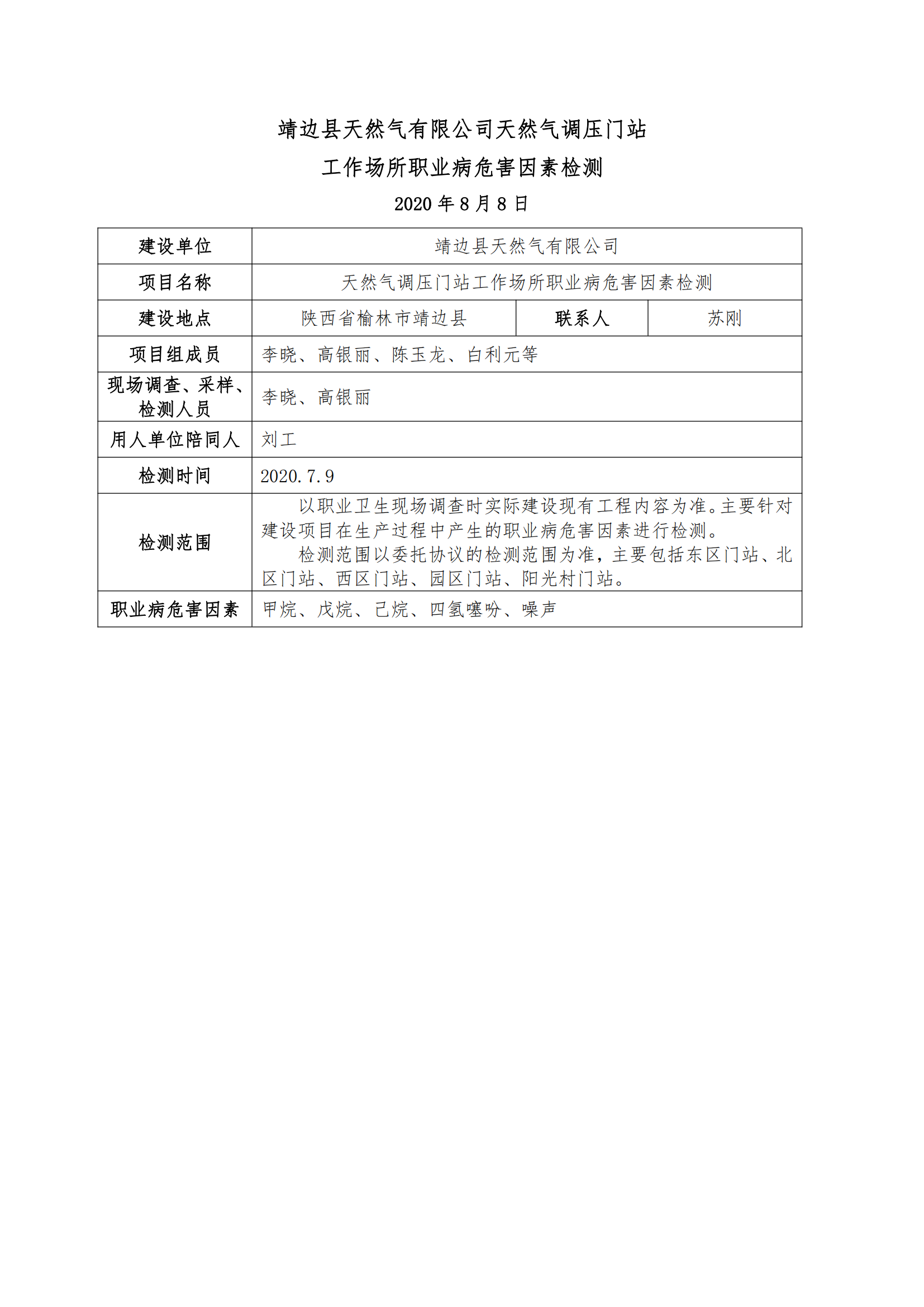 靖邊縣天然氣有限公司天然氣調(diào)壓門站工作場(chǎng)所職業(yè)病危害因素檢測(cè)