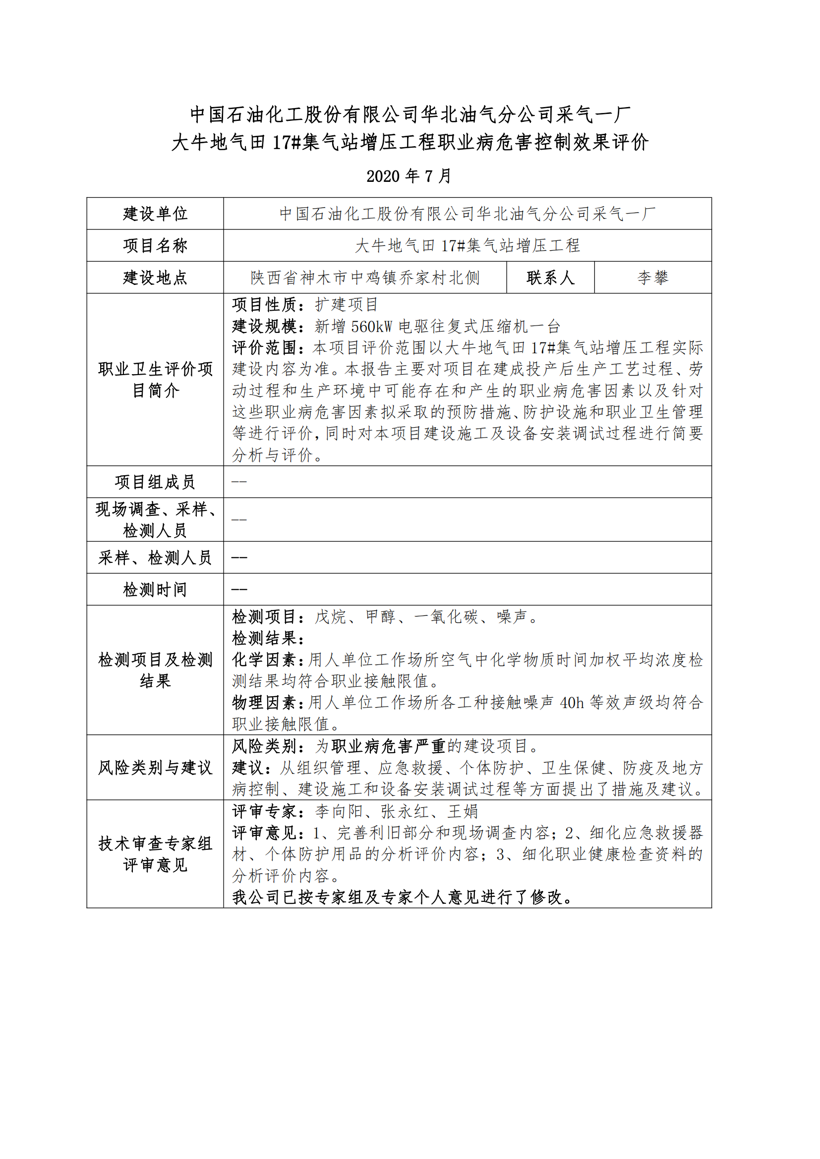 中國石油化工股份有限公司華北油氣分公司采氣一廠大牛地氣田17#集氣站增壓工程職業(yè)病危害控制效果評價