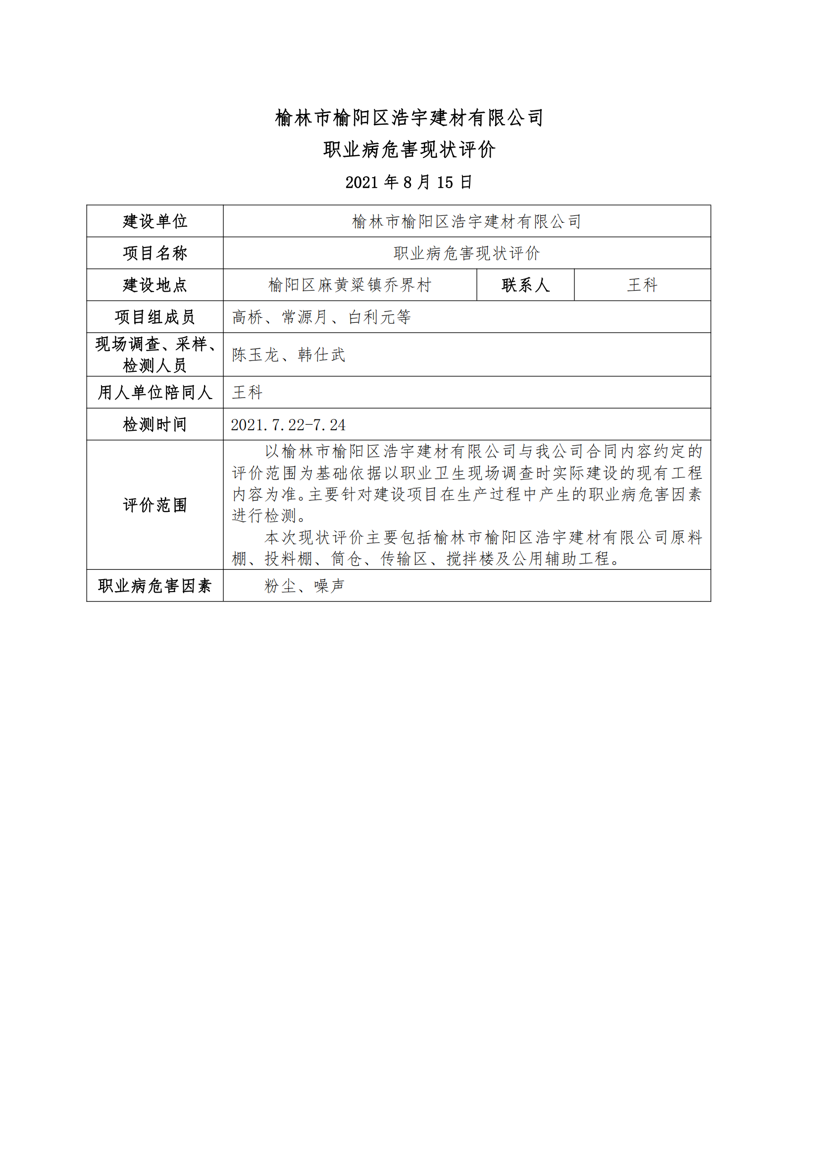 榆林市榆陽區(qū)浩宇建材有限公司職業(yè)病危害現(xiàn)狀評價(jià)