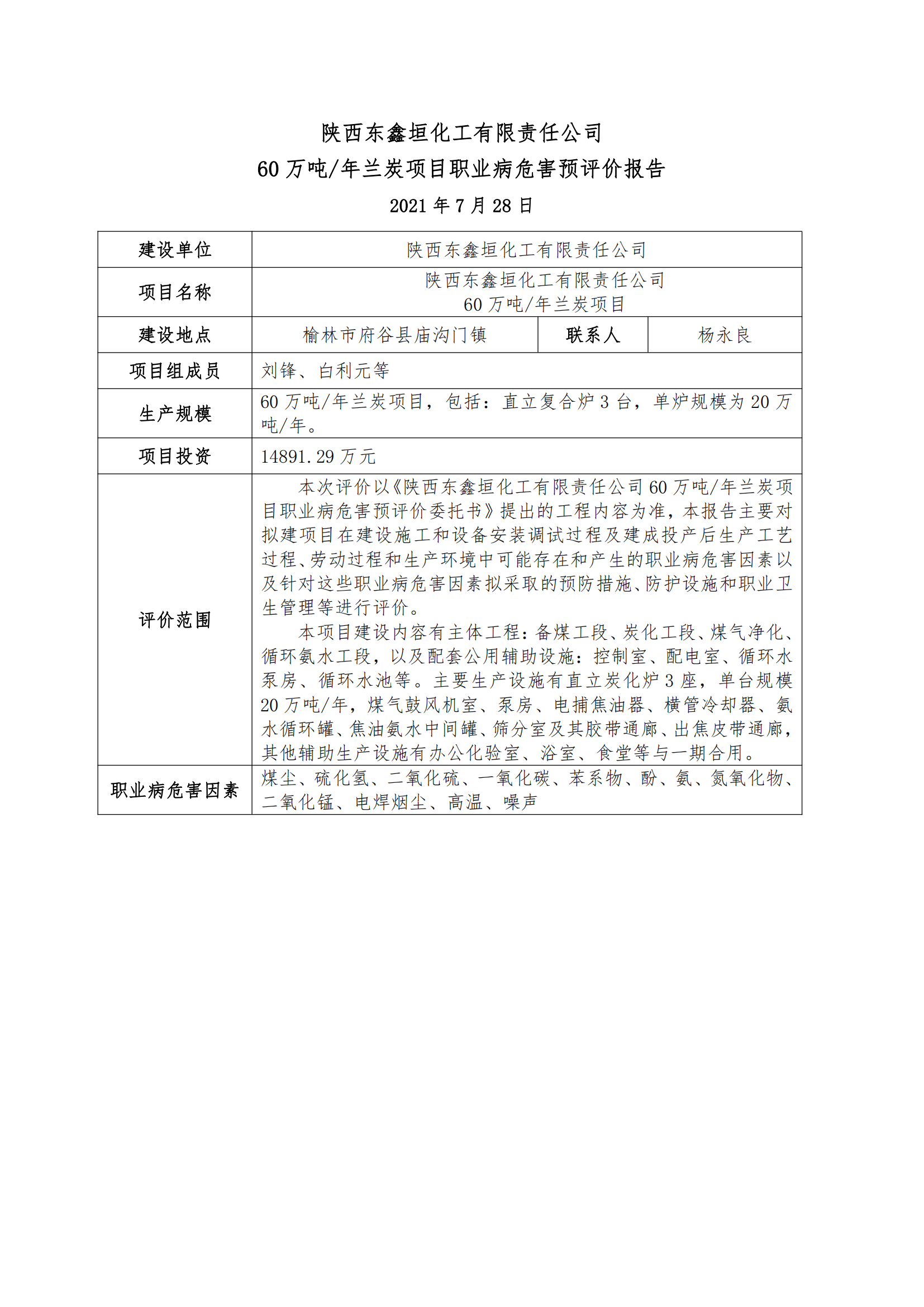 陜西東鑫垣化工有限責(zé)任公司60萬噸年蘭炭項(xiàng)目職業(yè)病危害預(yù)評價(jià)報(bào)告