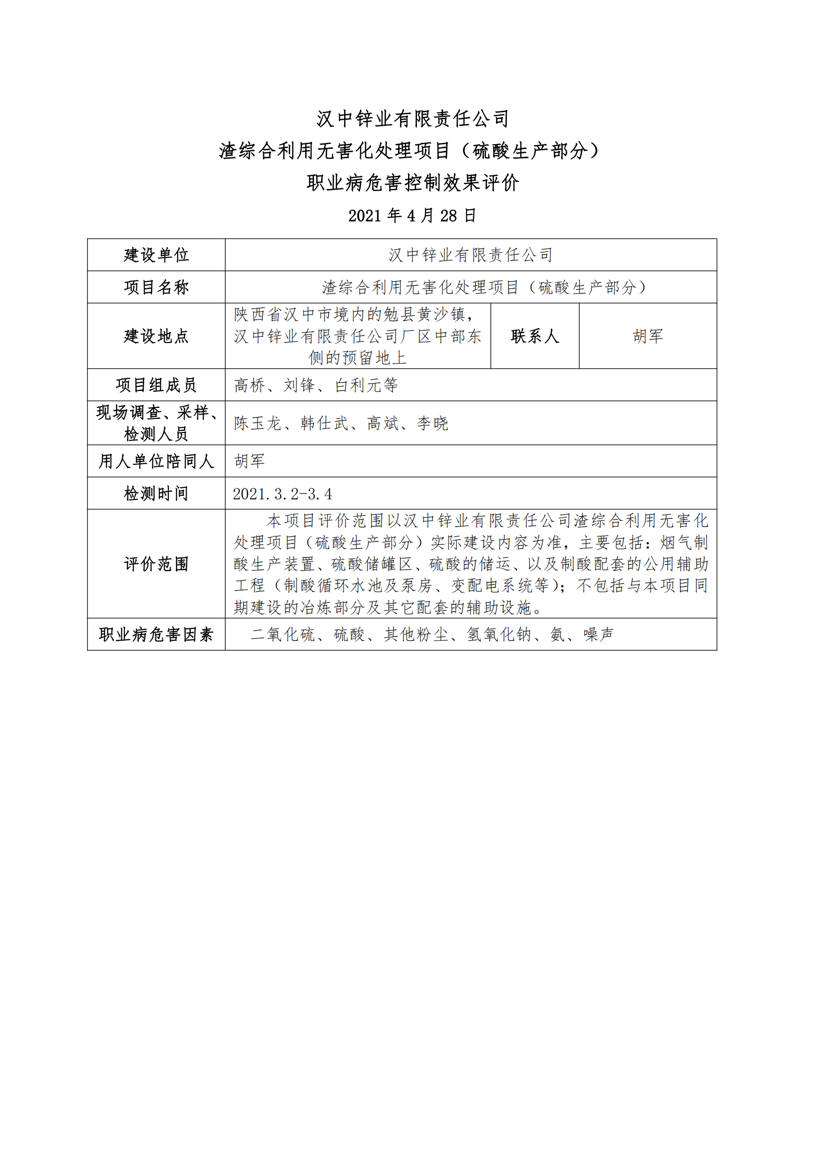 漢中鋅業(yè)有限責(zé)任公司渣綜合利用無(wú)害化處理項(xiàng)目(硫酸生產(chǎn)部分)職業(yè)病危害控制效果評(píng)價(jià)