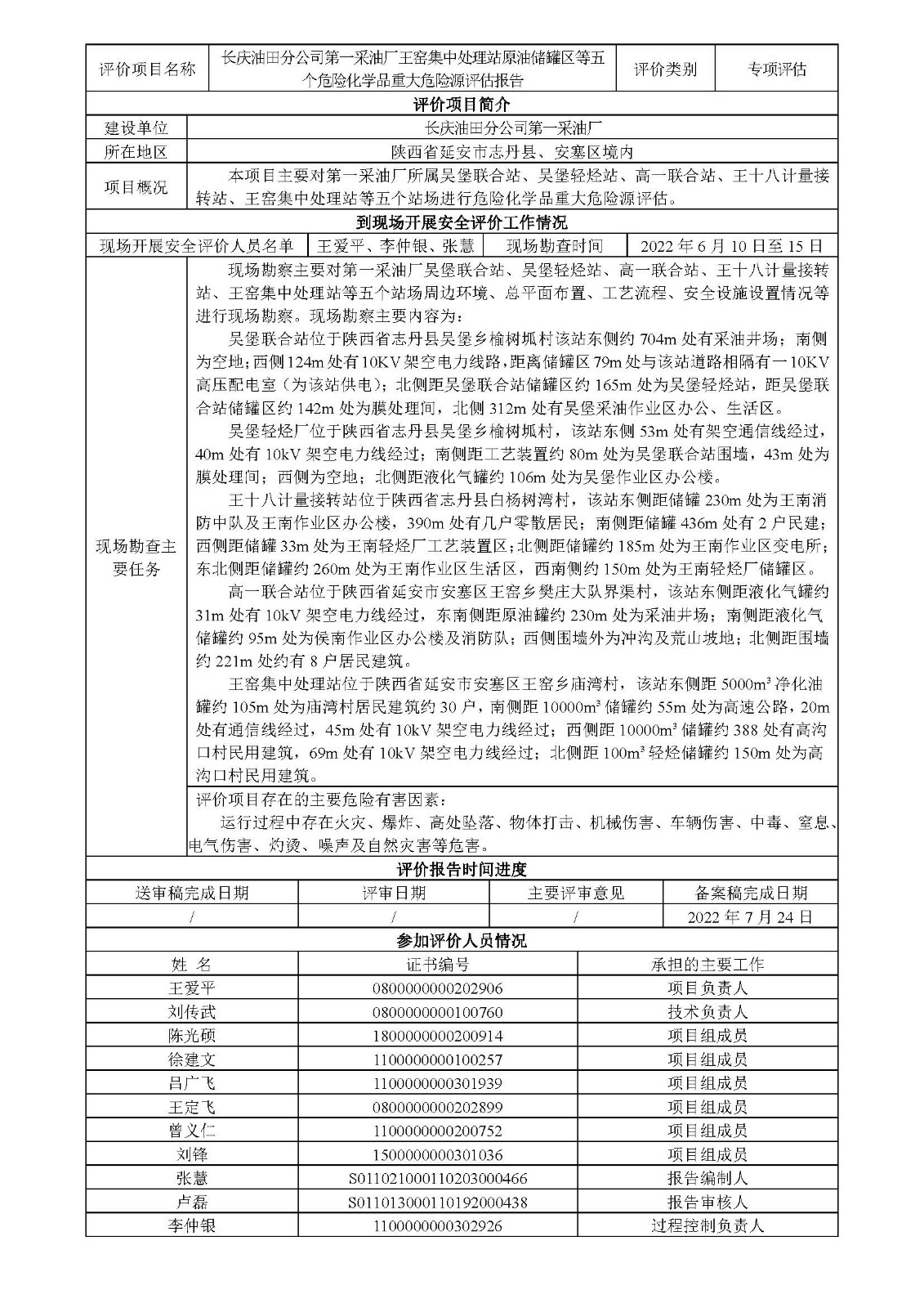 KLDAP[2022]-4.8 長慶油田分公司第一采油廠王窯集中處理站原油儲(chǔ)罐區(qū)等五個(gè)危險(xiǎn)化學(xué)品重大危險(xiǎn)源評(píng)估