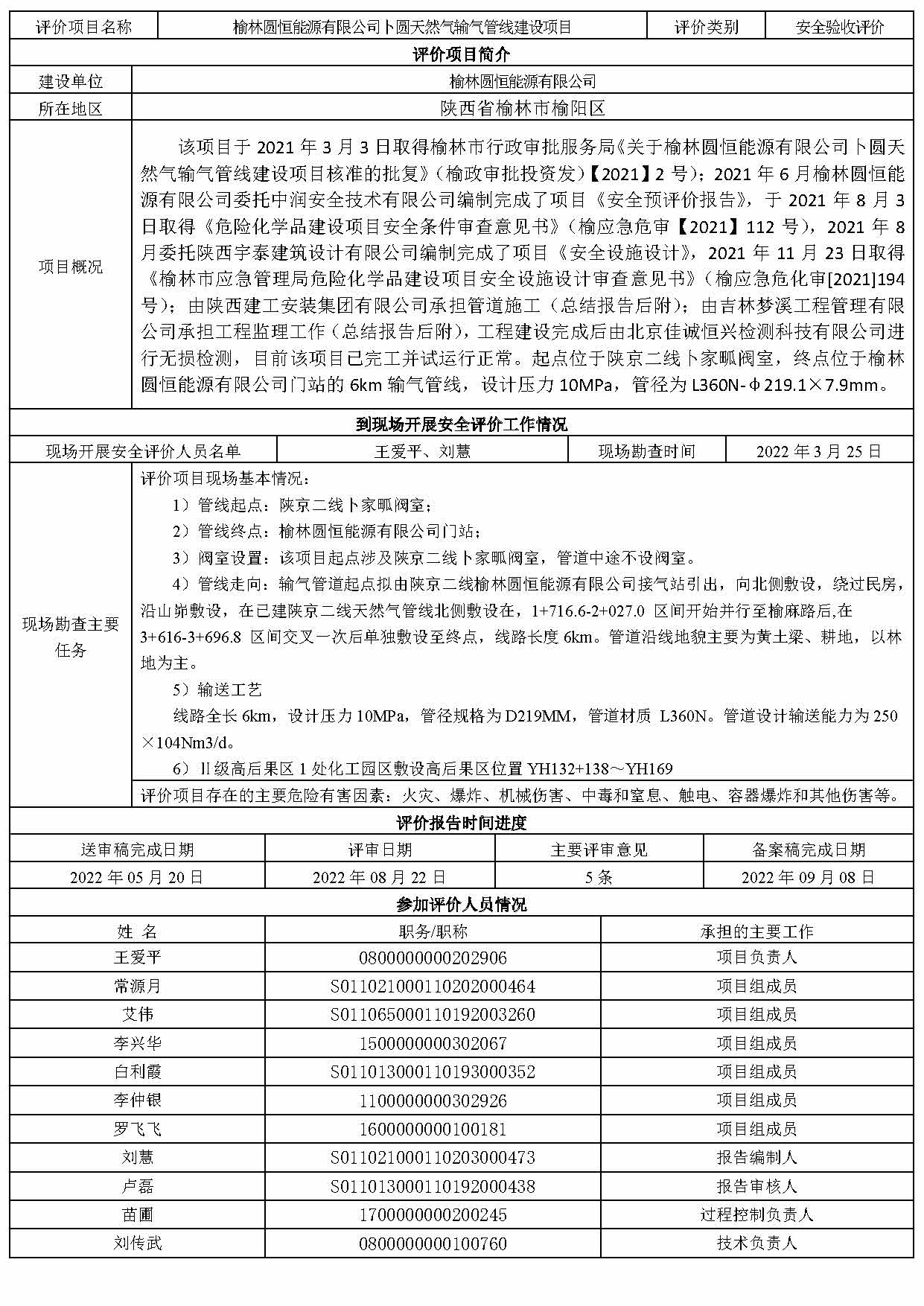KLDAP[2022]-1.1 榆林圓恒能源有限公司卜圓天然氣輸氣管線建設(shè)項目安全驗收評價