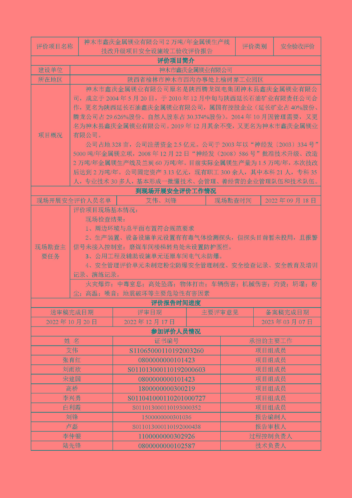 KLDAP[2022]-4.13 神木市鑫慶金屬鎂業(yè)有限公司2萬(wàn)噸/年金屬鎂生產(chǎn)線技改升級(jí)項(xiàng)目安全設(shè)施竣工驗(yàn)收評(píng)價(jià)