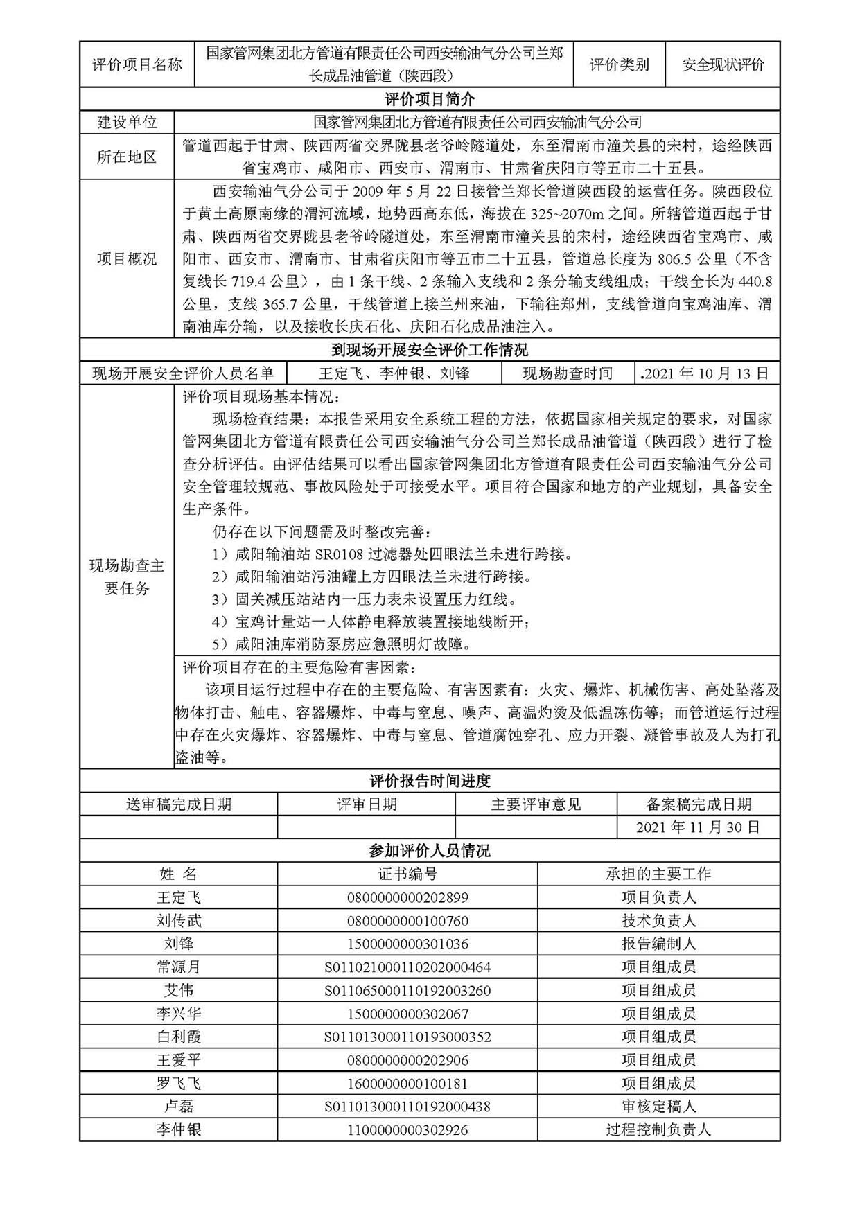 KLDAP[2021]-(現(xiàn))-16 國家管網(wǎng)集團北方管道有限責(zé)任公司西安輸油氣分公司蘭鄭長成品油管道(陜西段)安全現(xiàn)狀評價