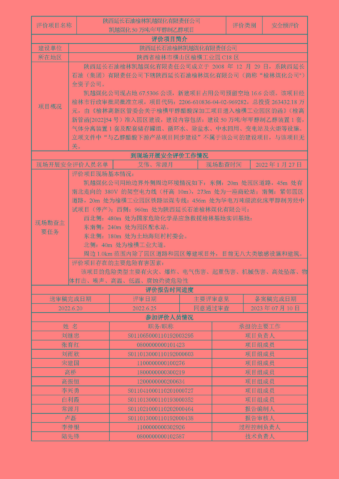 KLDAP[2022]-3.1 陜西延長石油榆林凱越煤化有限責(zé)任公司凱越煤化50萬噸年甲醇制乙醇項(xiàng)目安全預(yù)評(píng)價(jià)