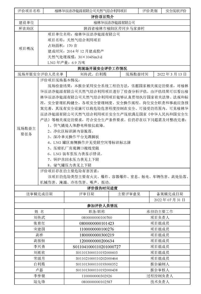 KLDAP[2022]-3.5 榆林華辰潔凈能源有限公司天然氣綜合利用項目安全現(xiàn)狀
