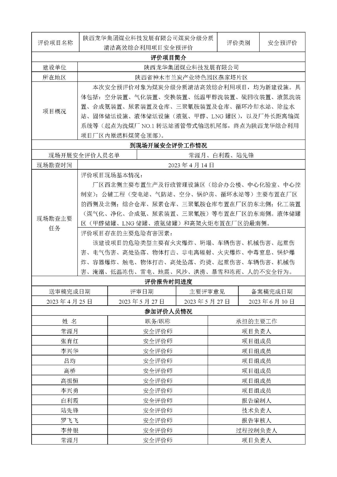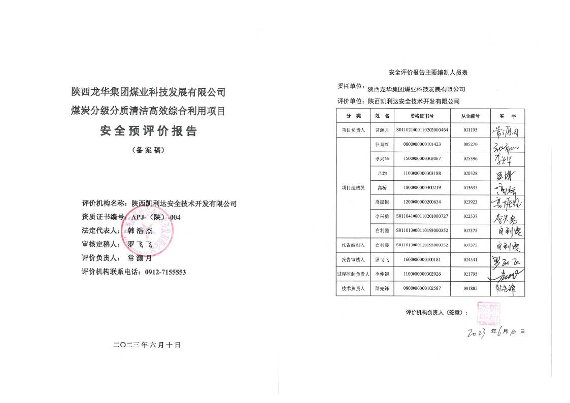 KLDAP[2023]-3.1 陜西龍華集團煤業(yè)科技發(fā)展有限公司煤炭分級分質(zhì)清潔高效綜合利用項目安全預(yù)評價