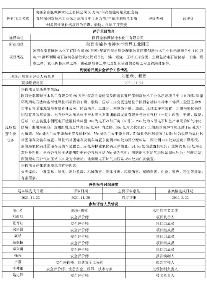 KLDAP-[2022]-2.2 陜西金泰氯堿神木化工有限公司110萬噸年循環(huán)利用電石渣制備活性氧化鈣項(xiàng)目的干燥、煅燒、壓球工序變更安全預(yù)評價(jià)