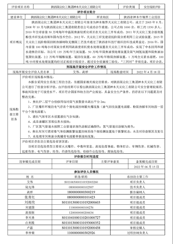KLDAP-[2022]-2.8 陜西煤業(yè)化工集團天元化工有限公司安全現(xiàn)狀評價
