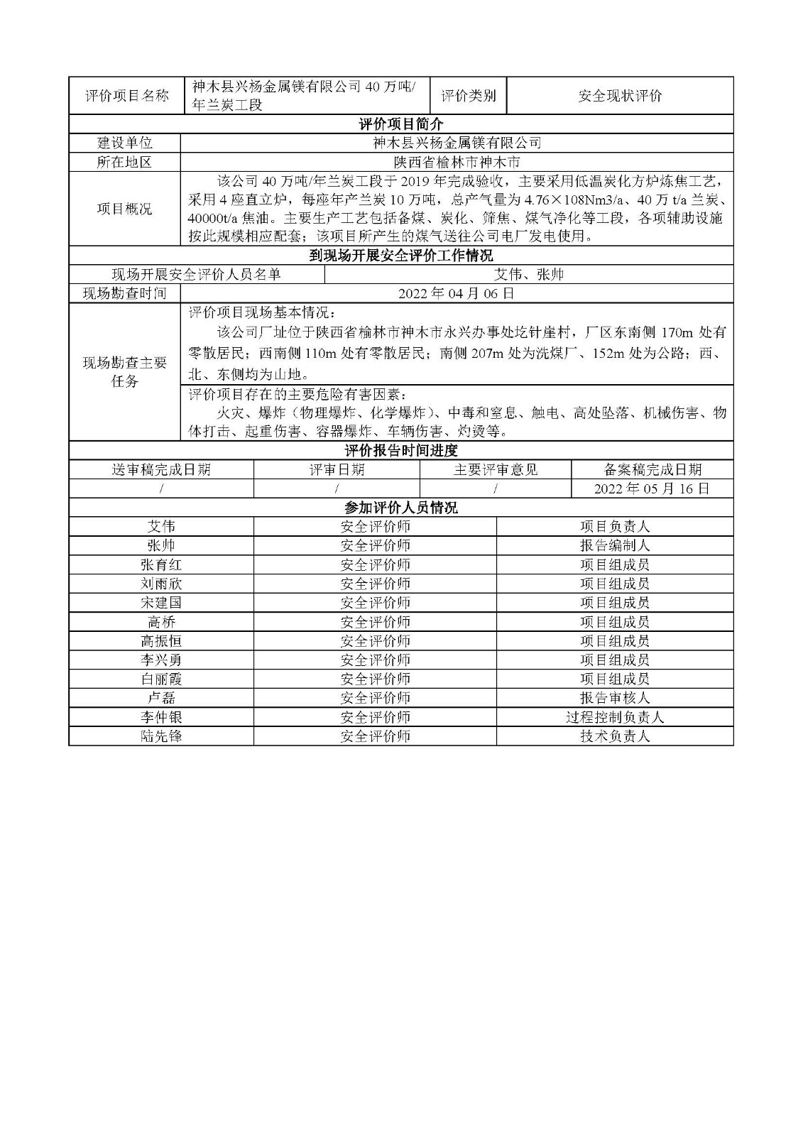 KLDAP[2022]-1.2 神木縣興楊金屬鎂有限公司40萬噸/年蘭炭工段安全現(xiàn)狀評價