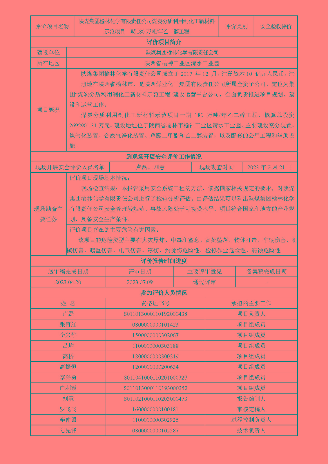 KLDAP[2023]-1.1 陜煤集團榆林化學(xué)有限責(zé)任公司煤炭分析利用制化工新材料示范項目一期180萬噸/年乙二醇工程安全驗收評價驗收