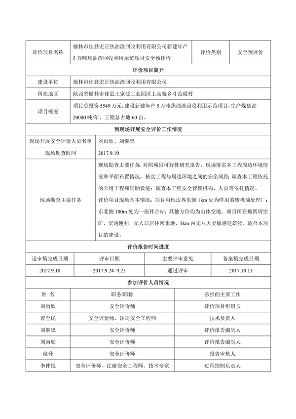 榆林市佳縣宏正焦油渣回收利用有限公司新建年產(chǎn)5萬噸焦油渣回收